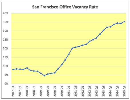 The Bay Area faces fundamental constraints making rapid population growth extraordinarily unlikely. With a median age of 41 years (compared to California’s 38.4), the region produces more deaths than births, yielding minimal or negative natural population change. Post-pandemic migration has turned consistently negative as remote work enables relocation to more affordable regions. Reflecting the impact of remote work, San Francisco now has the nation’s highest office vacancy rate at 35.4%, continuing to rise five years after the pandemic began.