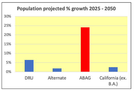 Two alternative benchmarks expose MTC/ABAG’s flawed projections. The California Department of Finance Demographic Research Unit (DRU) projects only 6.4% Bay Area growth from 2025 to 2050 — still unrealistically assuming the Bay Area will grow nearly three times faster than the rest of California (2.5%). An Alternate Scenario, adjusting for historical deceleration trends, projects just 1.9% growth, aligning with the remainder of the state’s 2.5% projection. MTC/ABAG’s forecast dramatically diverges from both benchmarks; its 24.1% projected growth for the Bay Area over the 2025–2050 period is nearly 10 times higher than DRU’s projection for the remainder of the state at 2.5%.