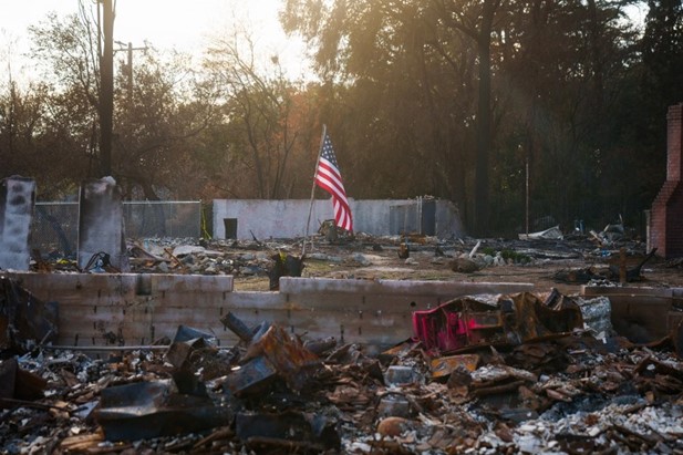 An American flag is among the burned remains of a home in Altadena on Feb. 8, 2025. Photo by Jules Hotz for CalMatters