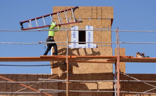 A construction crew member works on a townhome development on Redwood Boulevard near Wood Hollow Drive in Novato on Wednesday, Aug. 11, 2021. (Alan Dep/Marin Independent Journal)