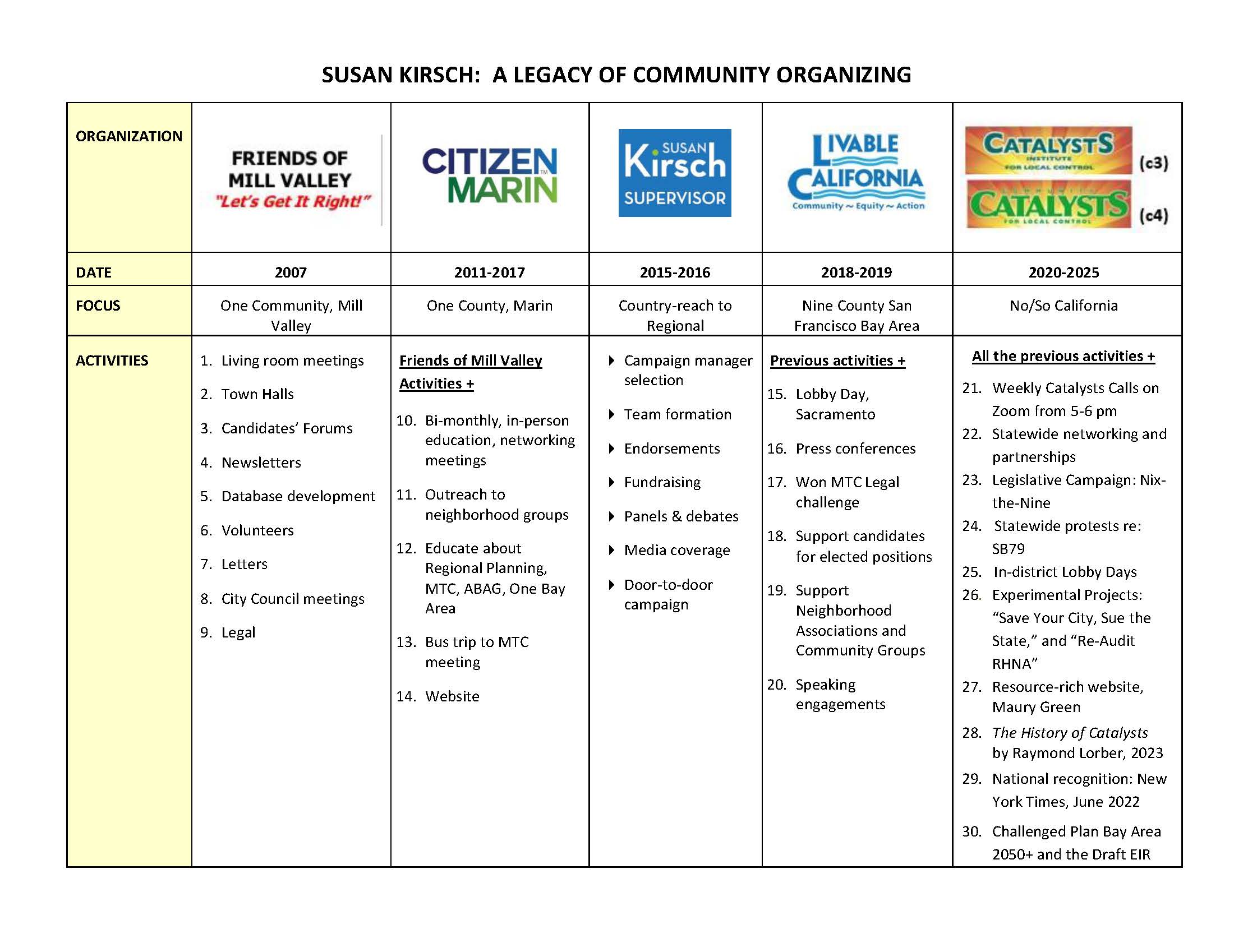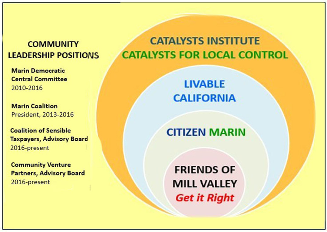 Founder and President of Catalysts for Local Control (c/4) and Catalysts Institute (c/3). Former president, Marin Coalition, co-founder of Livable CA, Citizen Marin, and Friends of Mill Valley. Retired educator, non-profit ED, and fundraising consultant.